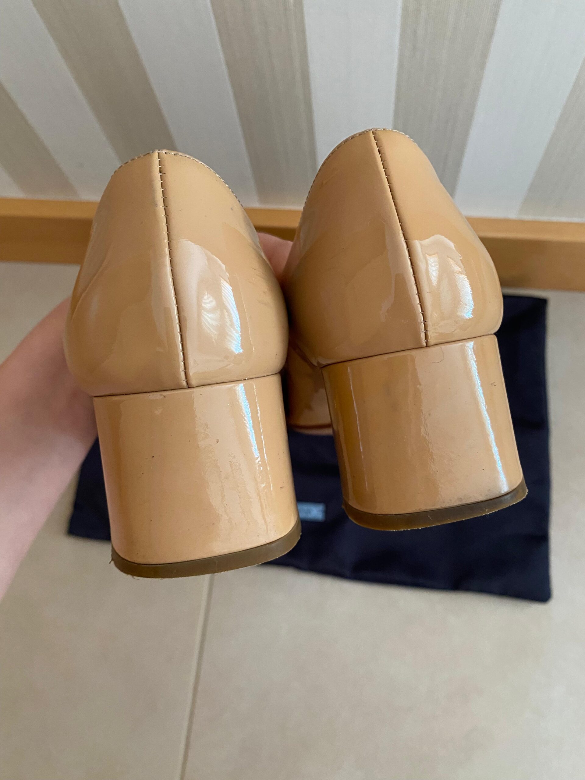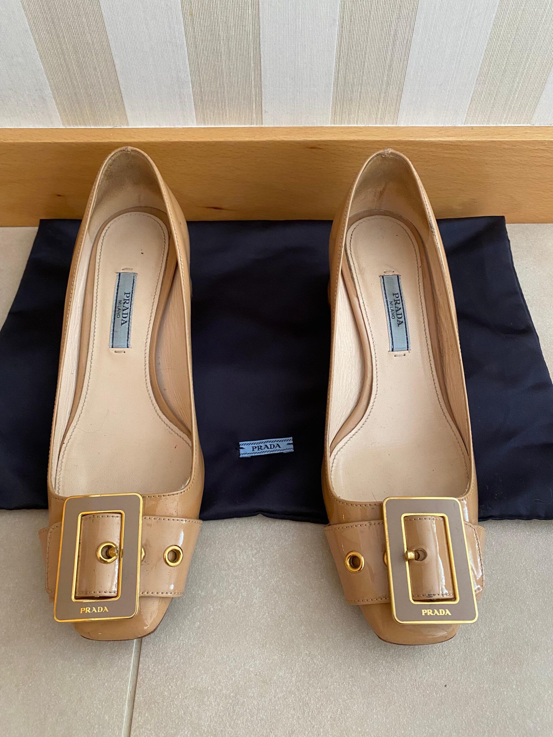 Prada ballet pumps in dark beige color, including cotton dust bag. Minimal wear and tear on the heal area and missing front belt small metal ring.