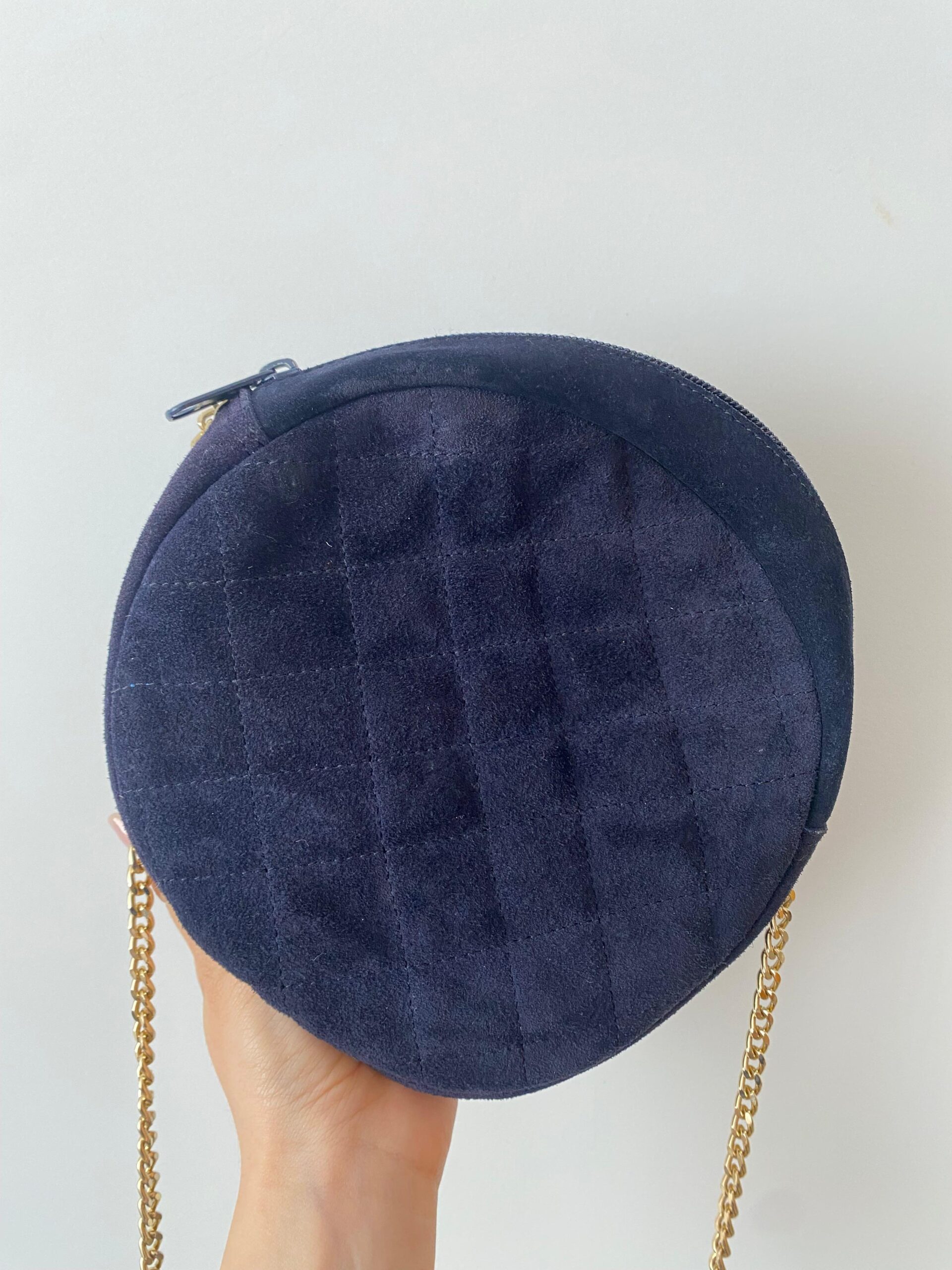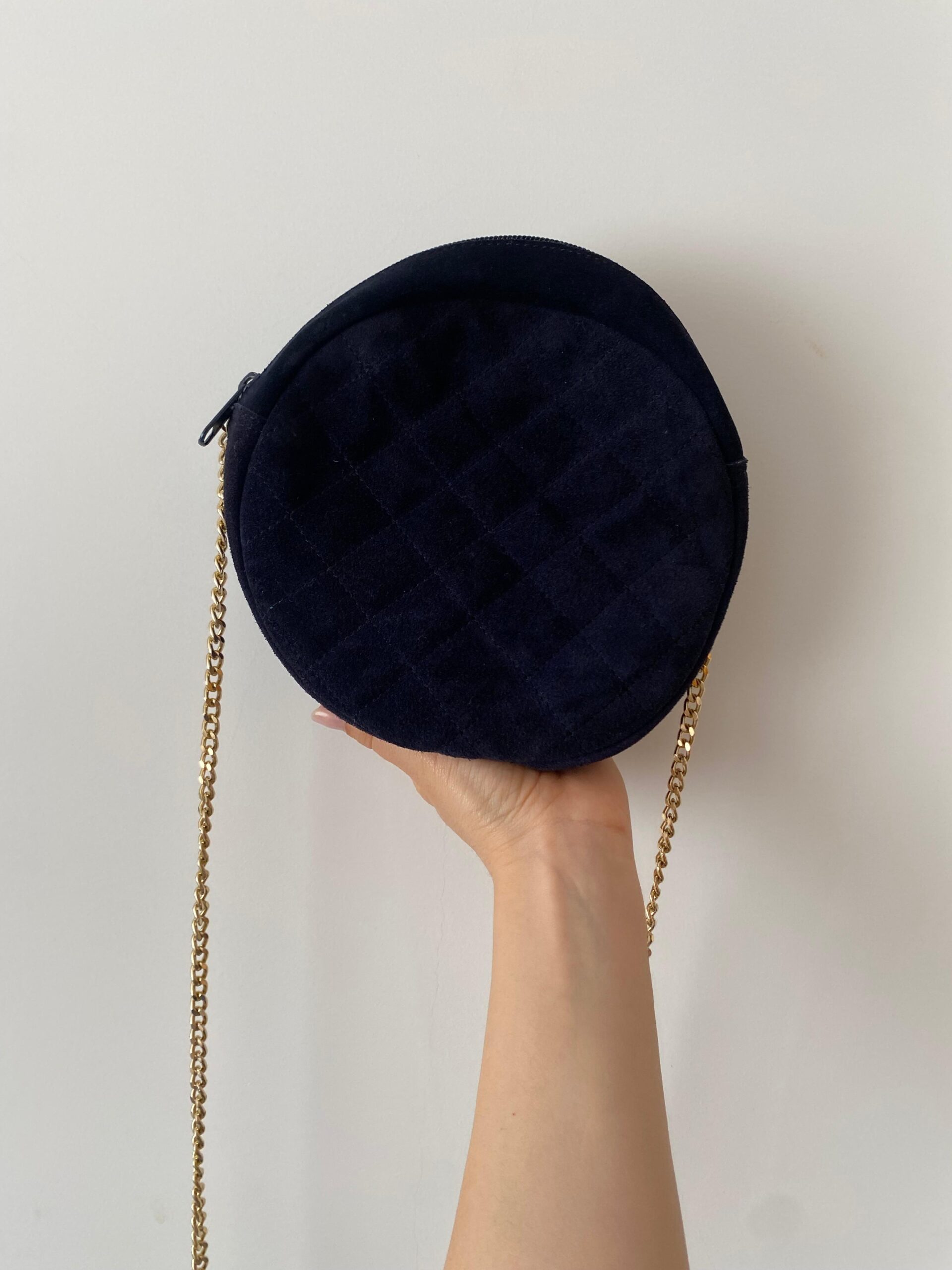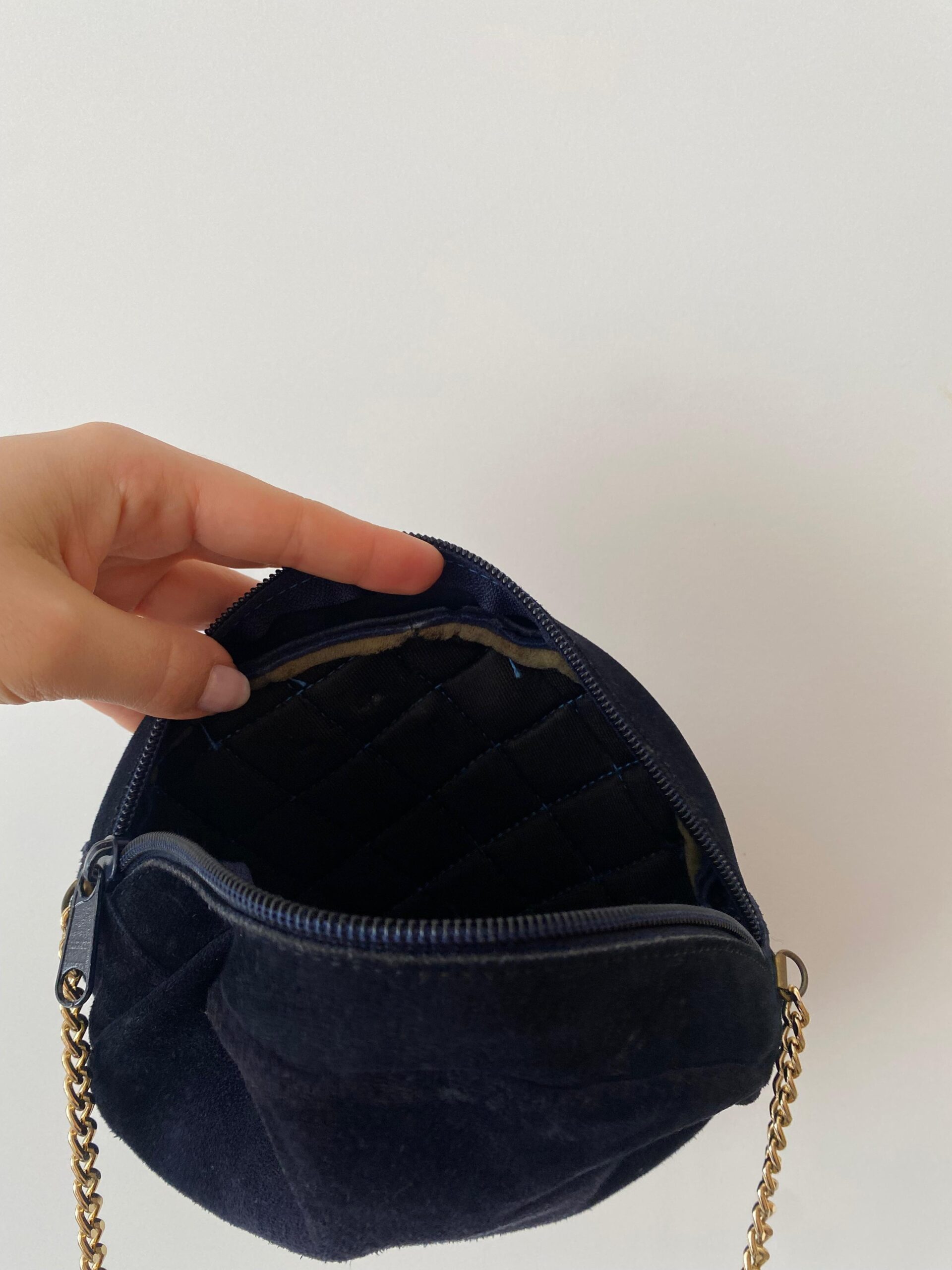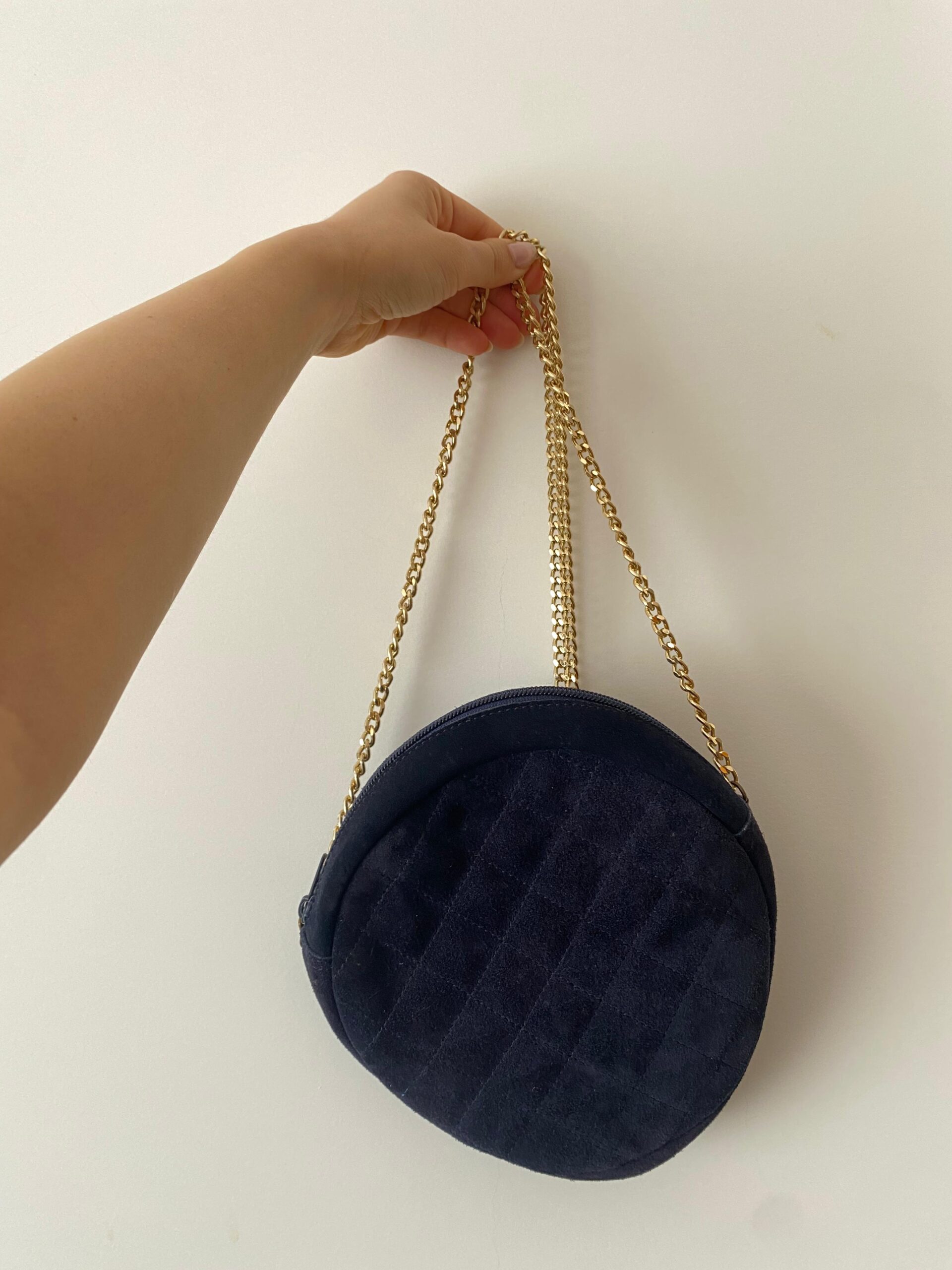Dark blue cross-body pouch with golden strap. Clean inside and out.