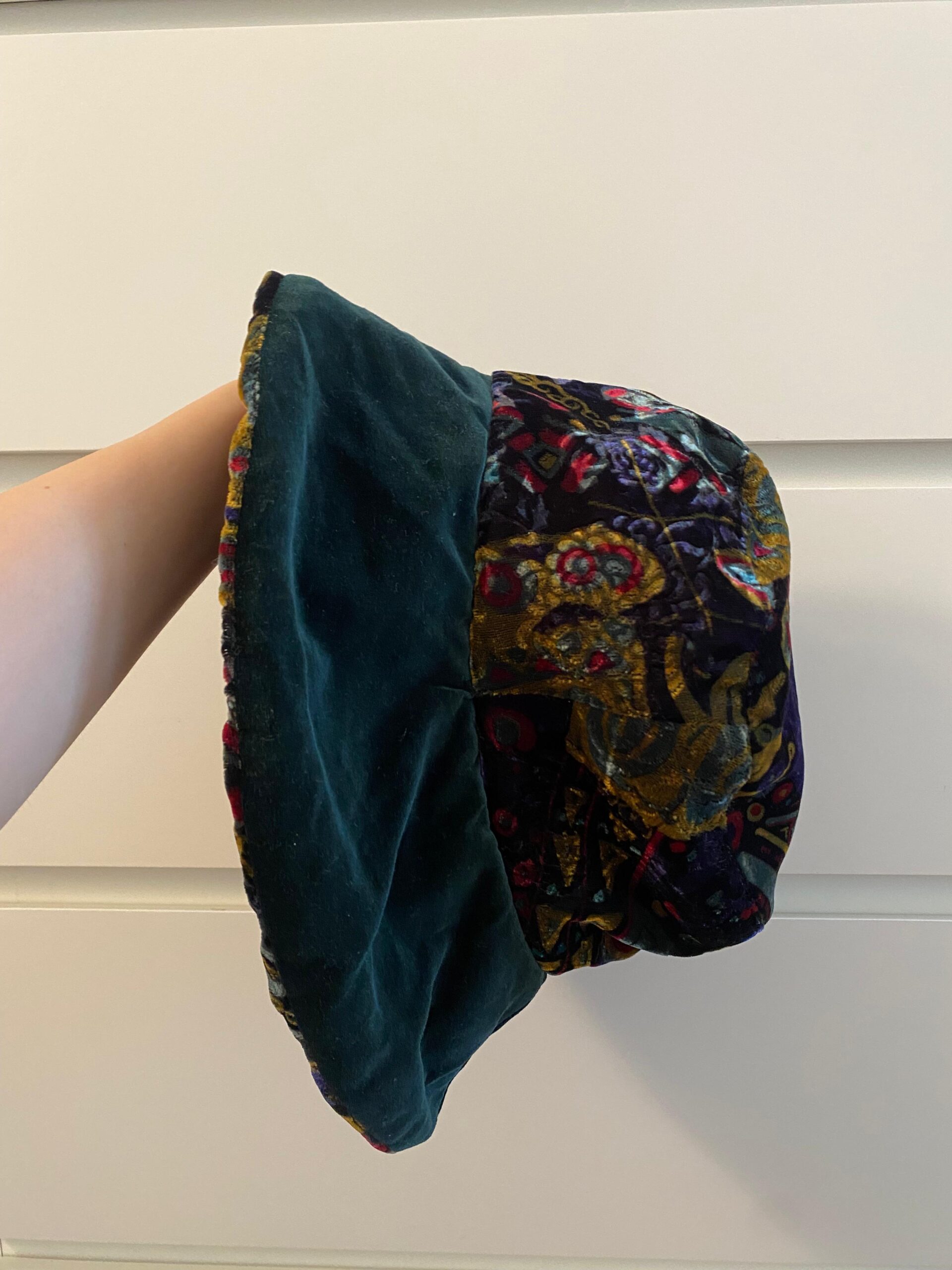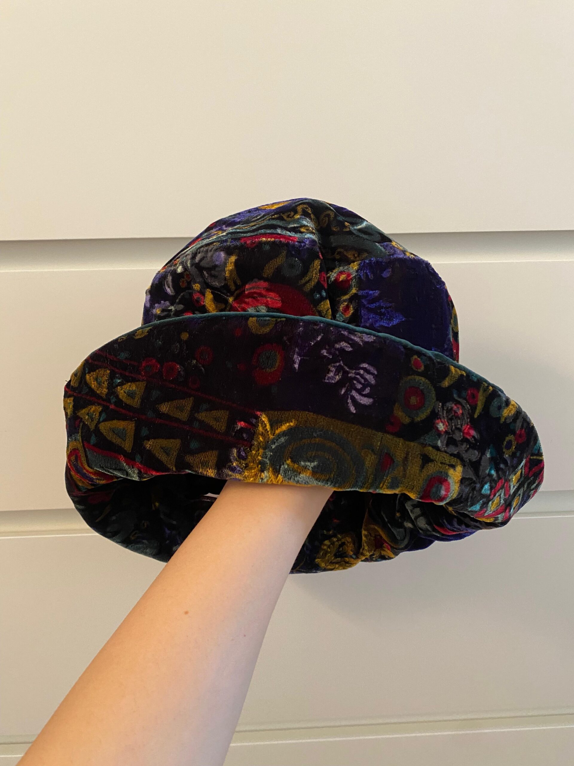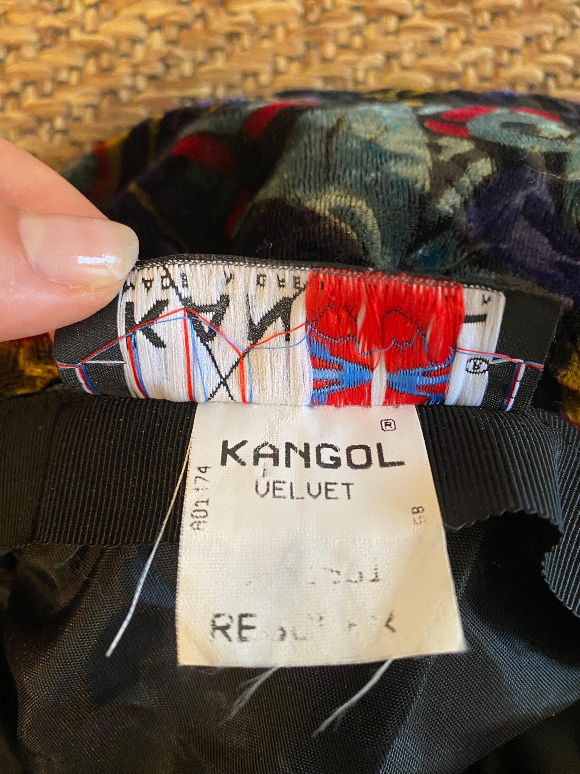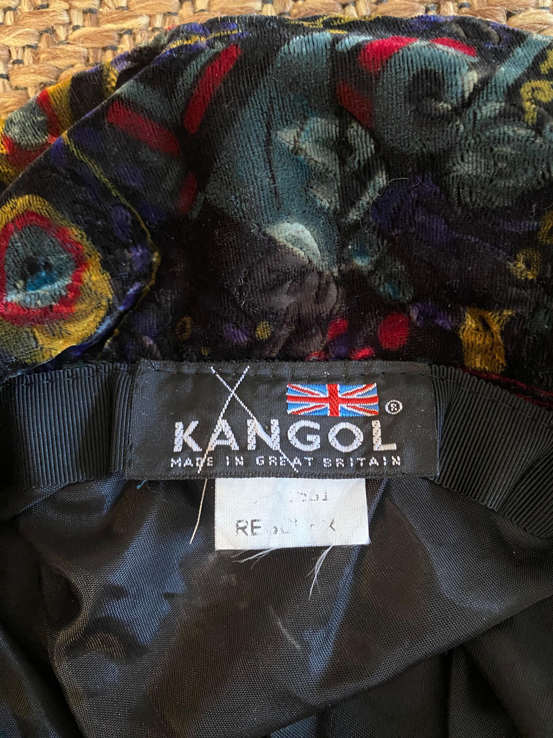 Kangol hat, made in England. Features a velvet pattern in different colors, with a dark green base. Clean inside and out.